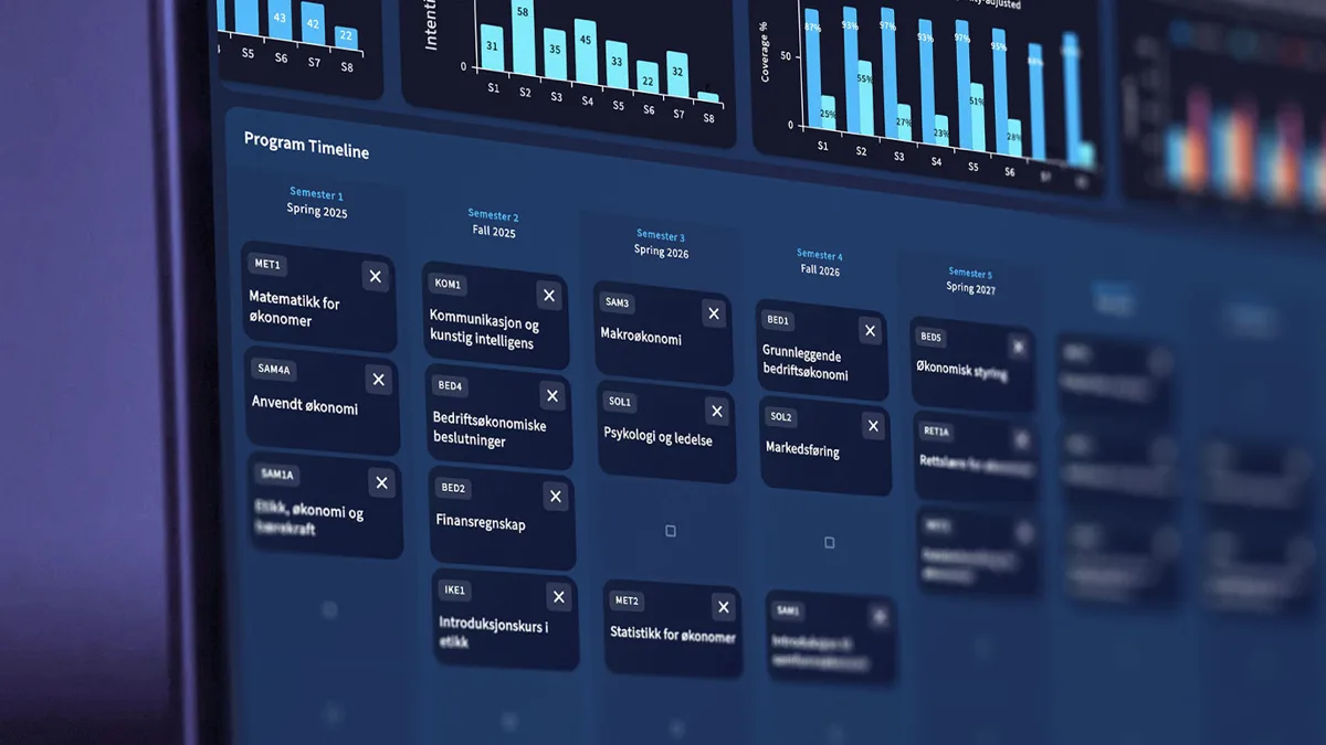 Drag courses into semesters and see program-level analytics update in real time — coverage, learning outcome exposure, and ECTS progress all in one view.